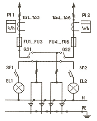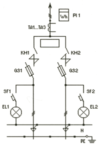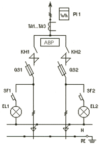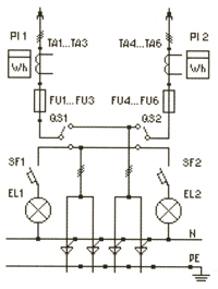 | ВРУ1-14-20УХЛ4 | 2*400 | FU1-FU6: Предохранители ПН2-400 PI1: Счетчик (учет общ. нагр.) PI2: Счетчик (учет домоупр. нагр.) QS1, QS2: Переключатели 400А SF1, SF2: Автоматические выключатели EL1, EL2: Лампы накаливания TA1-TA3: Трансф-ры тока 200/5...400/5 | |