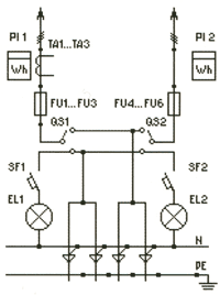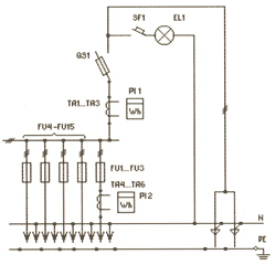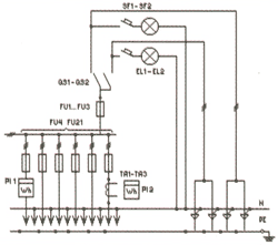 | ВРУ1-12-10УХЛ4 | 2*250 | FU1-FU6: Предохранители ПН2-250 PI1: Счетчик (учет общ. нагр.) PI2: Счетчик (учет домоупр. нагр.) QS1, QS2: Переключатели 250А SF1, SF2: Автоматические выключатели EL1, EL2: Лампы накаливания TA1-TA3: Трансф-ры тока 50/5...200/5 | |