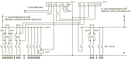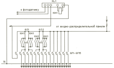 Рис. 3 QS1-QS3: Разъединители QF1-QF16: Автоматические выключатели KM1:Пускатель ПМЛ KV1: Промежуточное реле KL1: Фотореле ФР KT1: Реле времени 2РВМ |